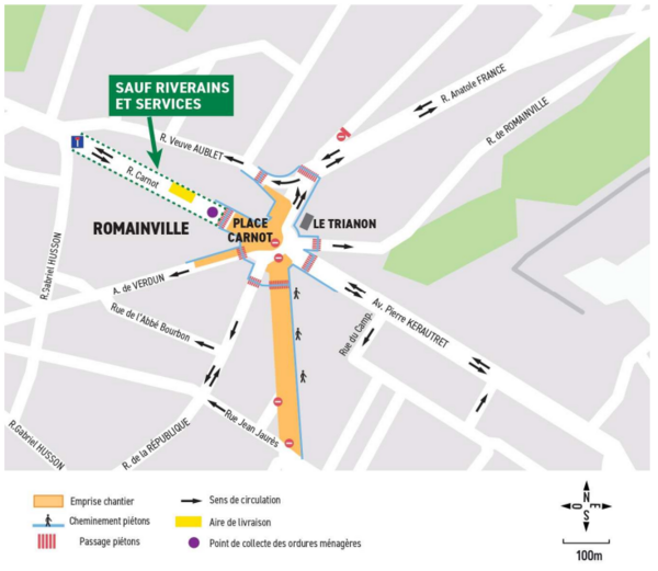 - La rue Anatole France ne débouchera pas directement sur la Place Carnot à partir de la rue Veuve Aublet. Les véhicules arrivant depuis la rue Anatole France devront prendre à droite la rue Veuve Aublet pour rejoindre la rue Gabriel Husson puis l’avenue de Verdun pour accéder à la Place Carnot. Une déviation générale des poids lourds sera réalisée depuis le centre-ville de Noisy-le-Sec.